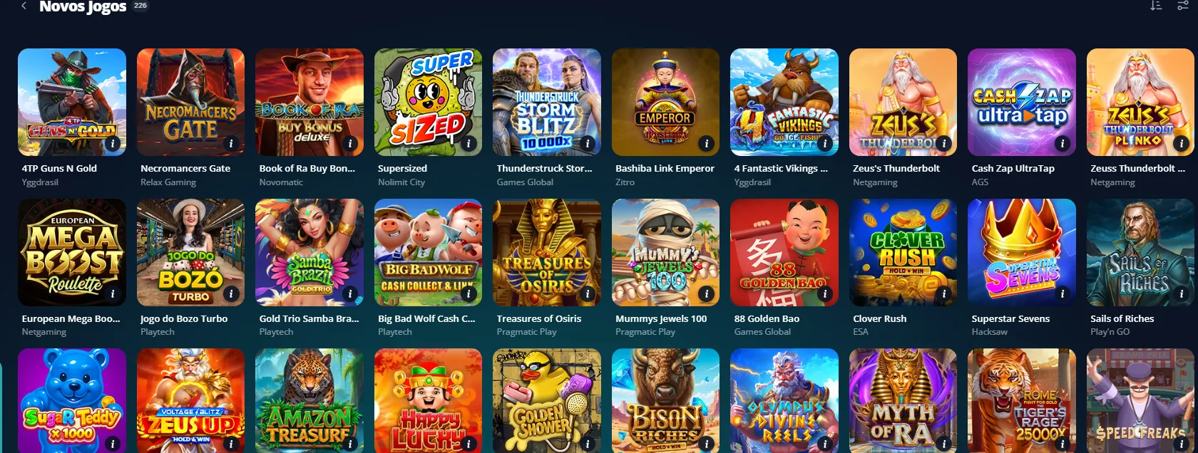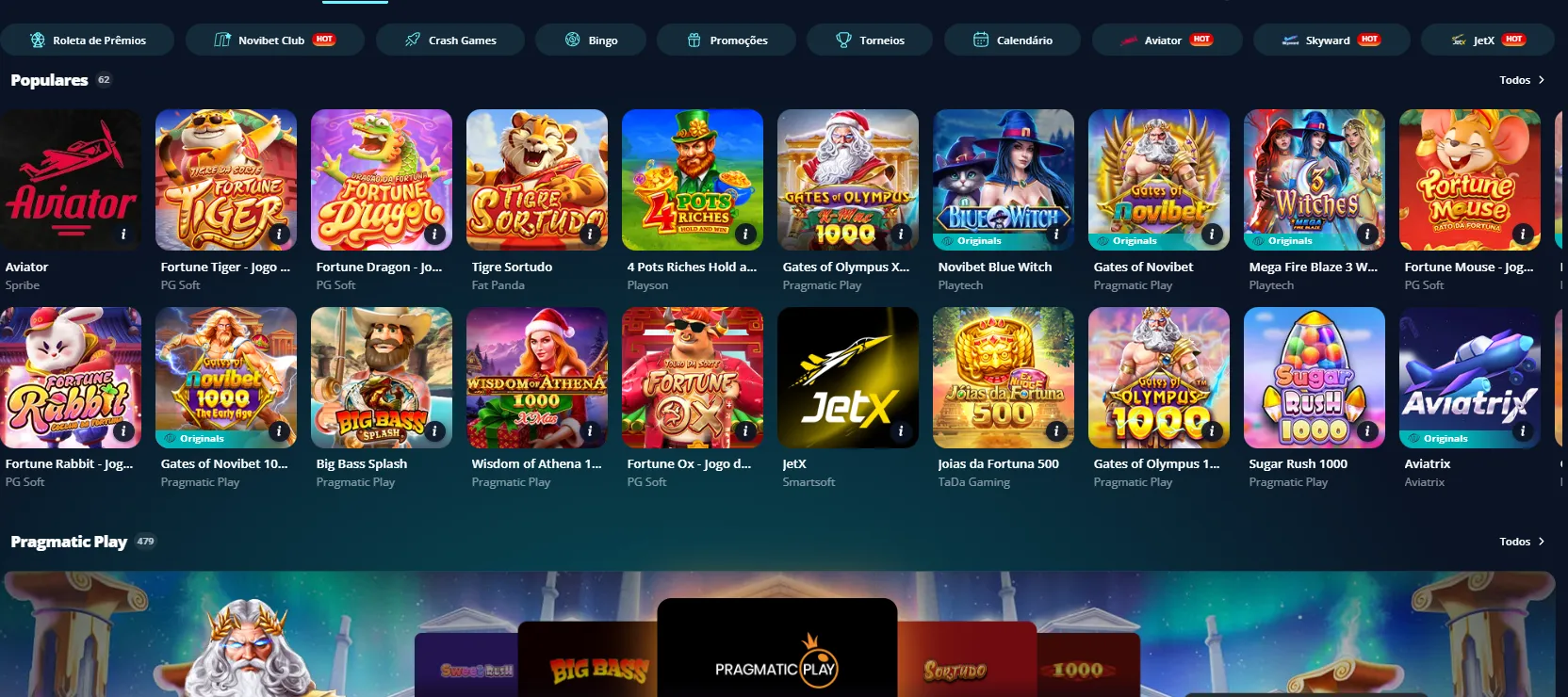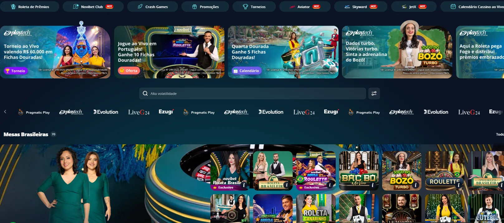 A Novibet apresenta uma biblioteca sólida, sustentada por fornecedores de alto padrão como Playtech e Evolution. Não se destaca por jogos proprietários exclusivos, mas compensa com estabilidade e diversidade confiável.